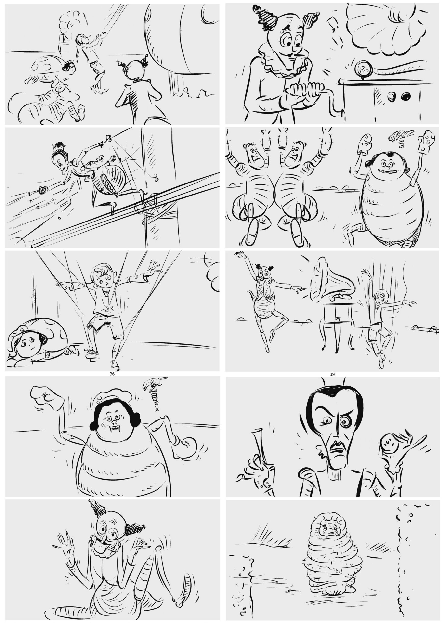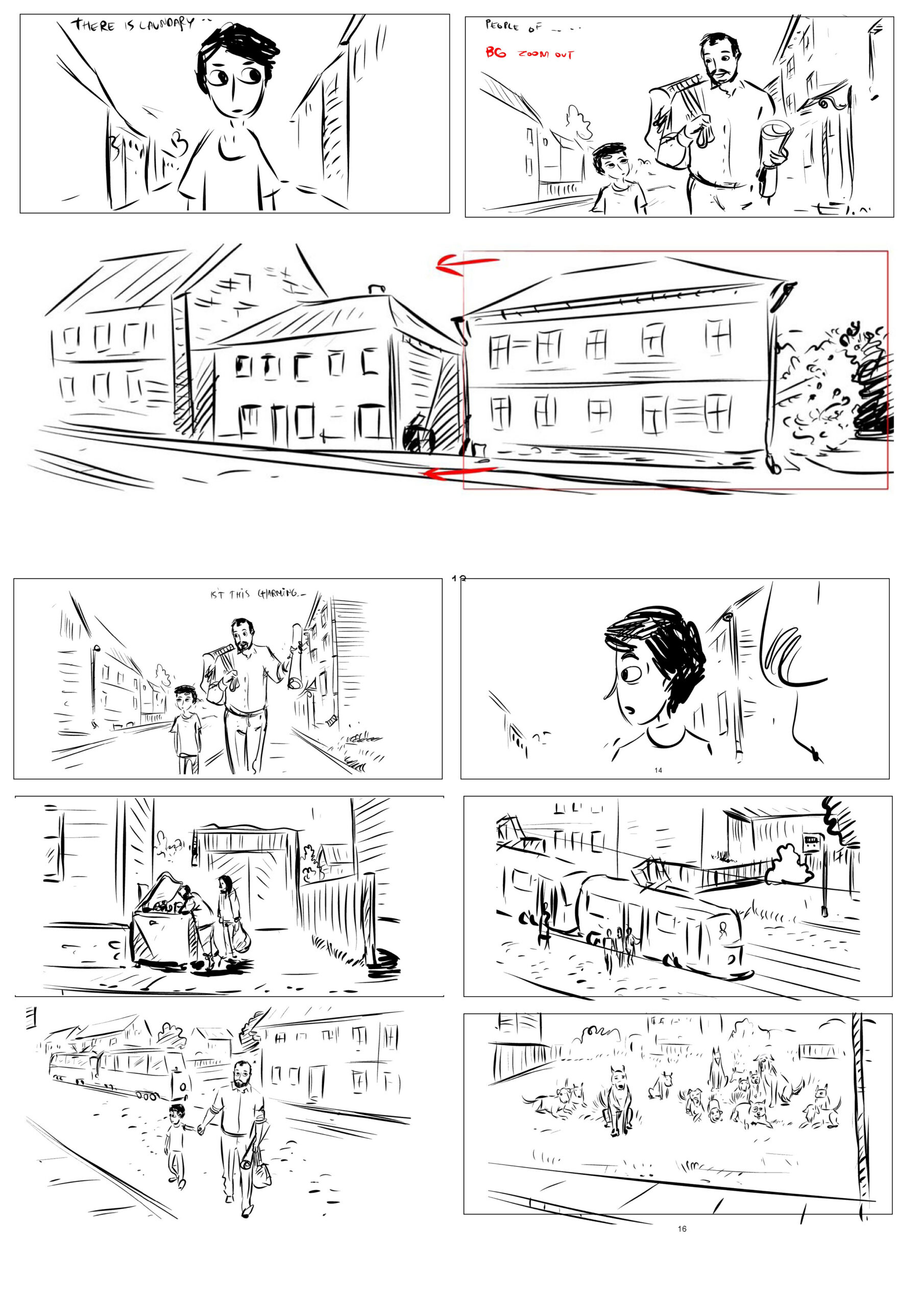 Kõige sagedamini on tulnud teha storyboarde reklaamfilmidele. Palju aastaid kestnud koostöö reklaamistuudiotega on näidanud, et storyboardi on vaja kliendi jaoks ja -ruttu, homseks ! Sellegi poolest teen (enamasti) hea meelega. Vahest tuleb pisut rohkem vaeva näha, kuna soovitakse rohkem detaili näha ja värvi kulub rohkem. Hea et arvutis värv otsa ei saa.